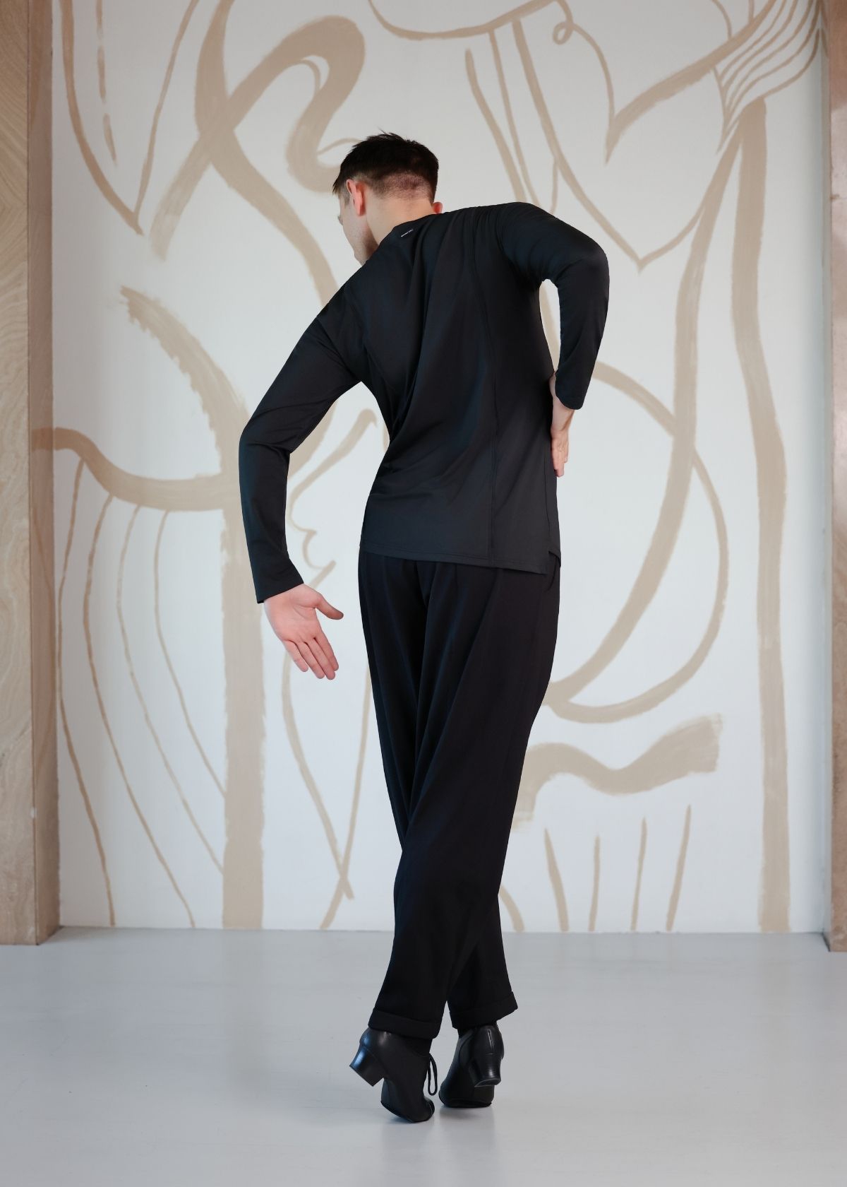 BENITO long sleeve is a men’s training top with a modern, expressive design. The key feature is its central asymmetric construction, created by an asymmetric center panel. This design forms a clean vertical line, visually elongates the silhouette, and highlights torso movement while maintaining balanced fit.The elastic polyamide fabric fits smoothly to the body, stretches well, and does not restrict movement. It maintains its shape during intensive training, remains comfortable for extended wear, and keeps a clean, professional appearance. Suitable for both training sessions and stage practice.ACTIVITY TYPE:Dance training, ballroom dance, contemporary, warm-up, stage practice.CARE:Hand wash or gentle machine wash up to 30°C.Do not bleach.Do not wring.Dry flat.Gentle steaming allowed.COMPOSITION:Polyamide — 80%, Elastane — 20%.