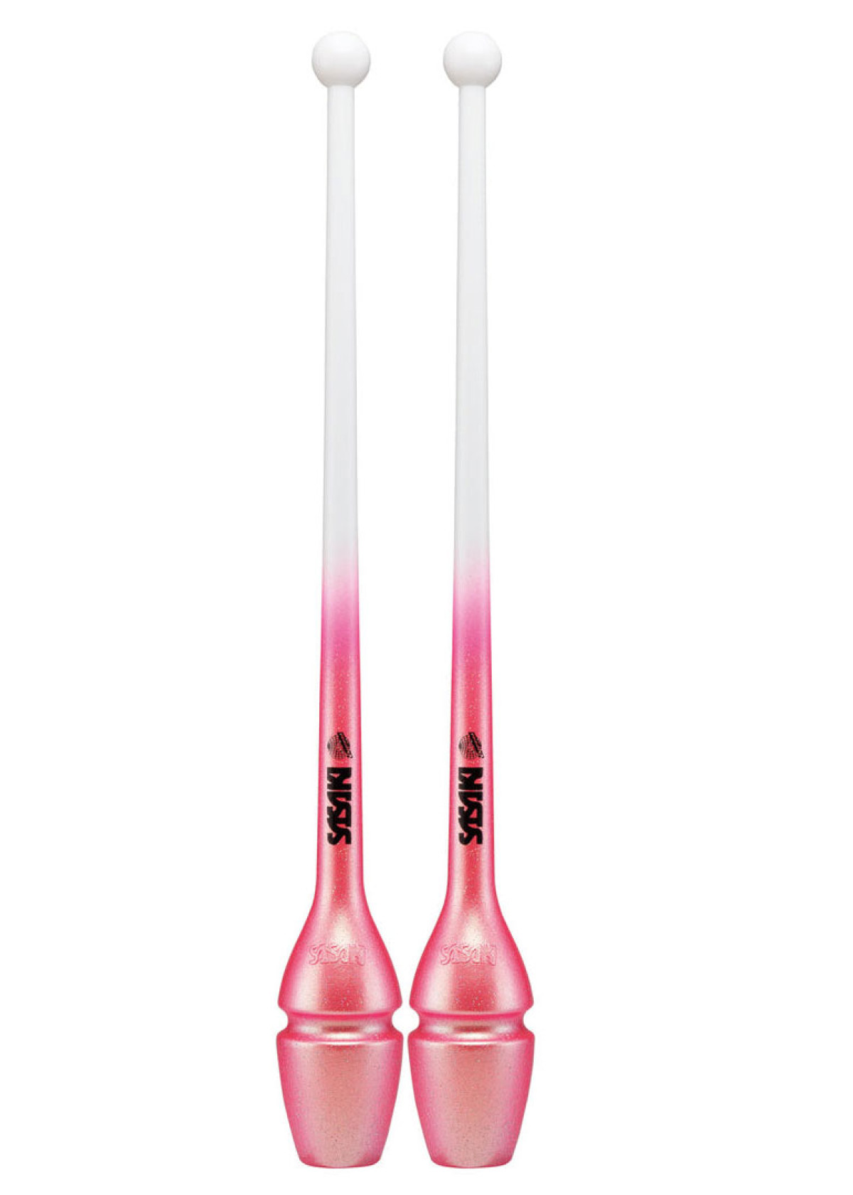 Clubs for Rhythmic Gymnastics SASAKI NEW FIG M-34JKGH, 40.5 cmProfessional SASAKI clubs, FIG certified and approved for international competitions. This model features a pearlescent gradient design, combining high functionality with elegant style. The one-piece construction with a reinforced fiberglass core ensures excellent stability, balance, and durability.The Double Lock Joint system allows adjustable connection depth depending on the technical requirements of elements. A special coating provides a soft velvety texture and enhances control.Note! The clubs have official FIG marking. Approved for international competitions.Key features:– Length: 40.5 cm– Weight: from 150 g– FIG certification– Elegant pearlescent gradient– Reinforced fiberglass core– Double Lock Joint– Durable one-piece constructionDecoration option:The clubs can be personalized using colorful adhesive tapes, allowing unique pattern designs.Care and use:Store in a special case. Use only on a gymnastics carpet. Wipe with a soft damp cloth.
