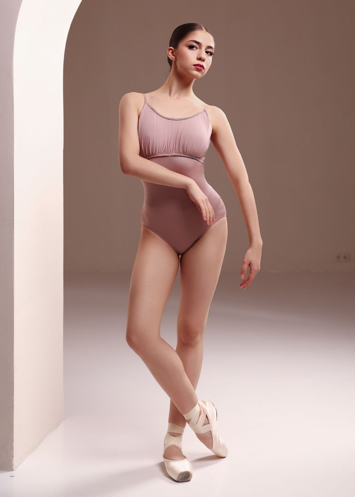 Купальник для танцев PENELOPE на бретелях – модель с мягкой кокеткой из коллекции AMOUAGE, созданной для тех, кто ценит эстетику в движении.AMOUAGE – это коллекция лаконичных купальников, в которых сочетаются визуальная выразительность и комфорт. Каждая модель выделяется акцентной деталью — драпировкой, сеткой или сочетанием фактур. Коллекция предназначена для занятий, выступлений и фотосессий.Модель PENELOPE оформлена мягкой драпированной кокеткой из сетки в зоне груди — это второй слой поверх основного материала. Деталь визуально смягчает силуэт и добавляет глубины. Спинка имеет глубокий вырез с плавной линией.Основные акценты:Тонкие бретели (camisole)Кокетка из драпированной сетки — второй слой на грудиГлубокий округлый вырез на спинеОсновная ткань — микрополиамид, зона груди оформлена сеткойАктуальна как для репетиций, так и для сценыМатериал: микрополиамидКокетка: мягкая сетка (драпированная, поверх основы)Уход: ручная или деликатная стирка в прохладной воде (до 30°C). Не использовать отбеливатель. Не выкручивать. Сушить в расправленном виде. Допускается деликатное отпаривание.